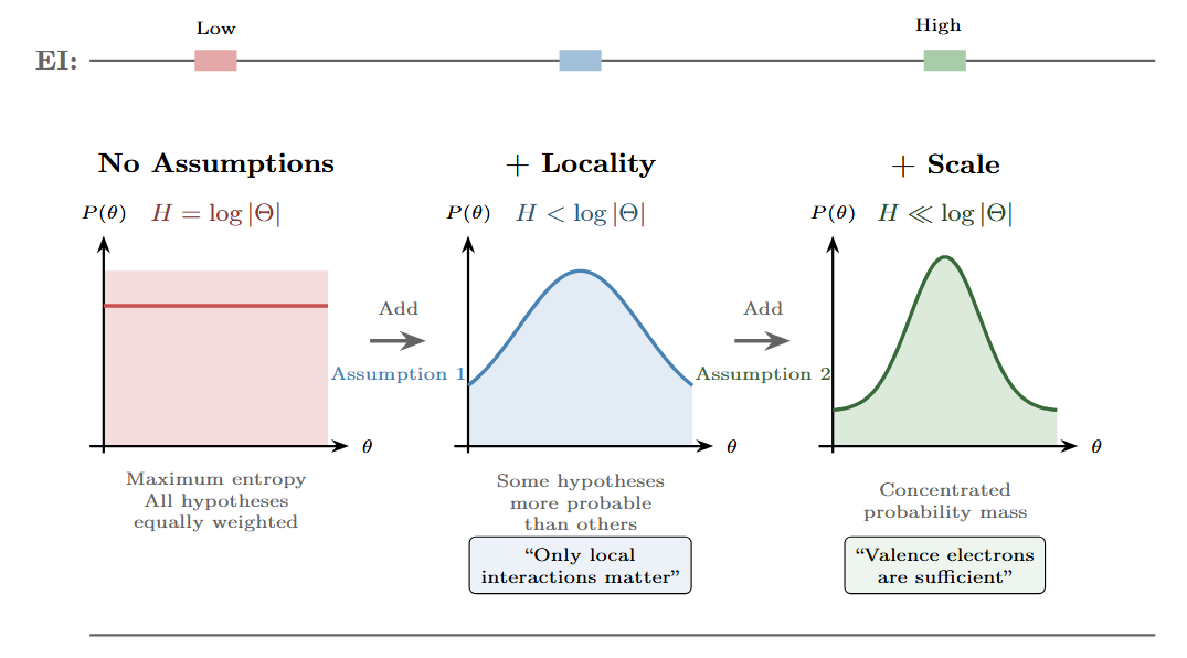 Figure 3: Assumptions constrain the probability space. Reading left to right: starting from maximum entropy (uniform prior over all hypotheses), each assumption narrows the probability distribution over possible descriptions. The first assumption (locality) rules out non-local interactions. The second (appropriate scale) focuses on valence electrons rather than full quantum states. Counterintuitively, the most constrained distribution—with the lowest entropy—has the highest effective information for predicting chemical bonding.