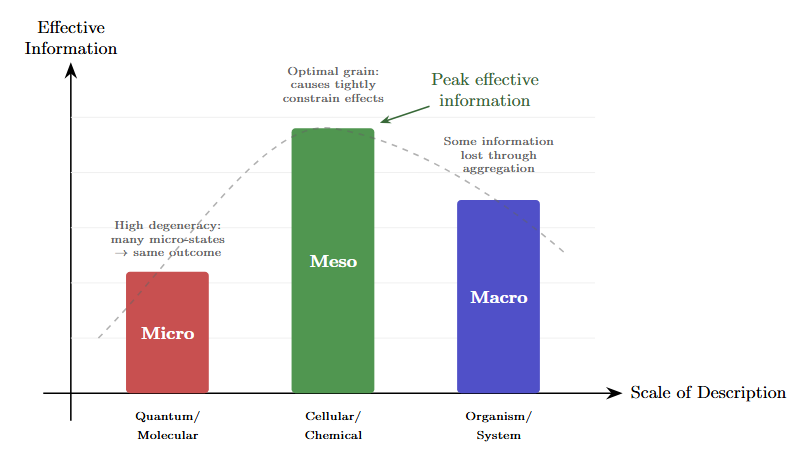 This observation has a name now, thanks to work by Erik Hoel and collaborators on what they call causal emergence (Hoel, Albantakis & Tononi, 2013). The technical measure is effective information: how tightly does knowing the cause constrain the effect?