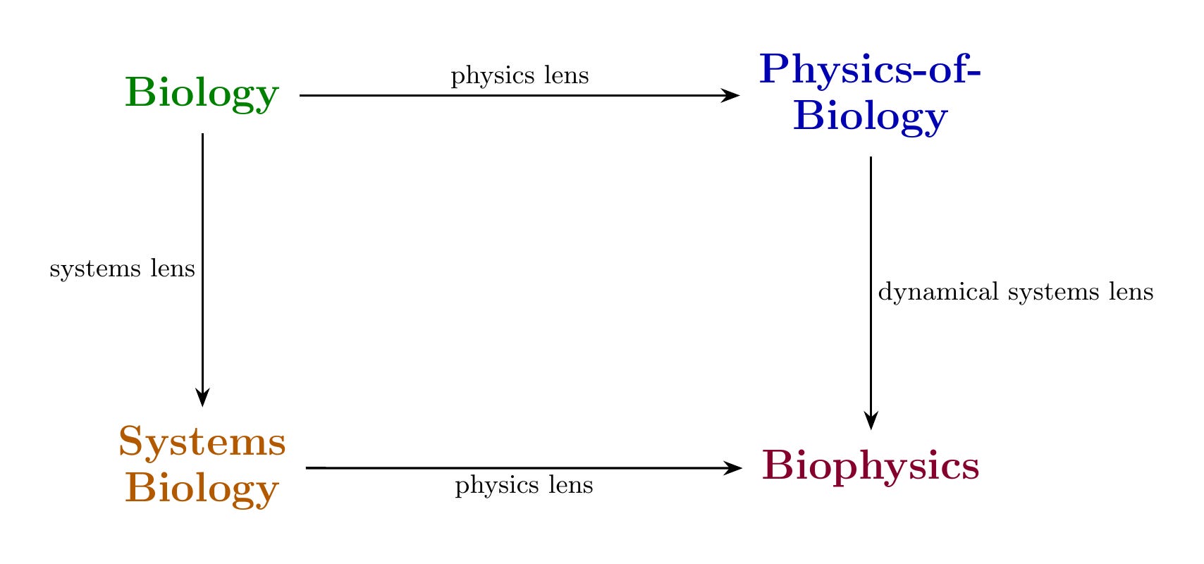Path 1: Biology → Physics-of-Biology → Biophysics. You measure physical quantities in a biological system, then ask how those quantities evolve dynamically. You get equations of motion, attractors, stability analysis.