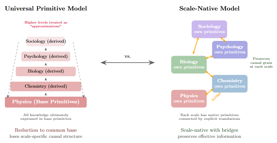 Figure 4: Two architectures for knowledge representation. Left: the Universal Primitive model assumes a single base layer (physics) with successive approximation layers stacked above, all ultimately grounded in shared primitives. This treats higher-level descriptions as degraded versions of fundamental descriptions. Right: the Scale-Native model treats each level as having its own appropriate primitives, connected by explicit bridge functions that translate between adjacent scales. This architecture preserves the causal grain appropriate to each level rather than forcing reduction to a common substrate.