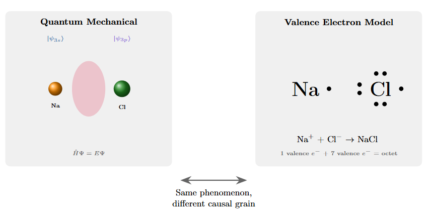 One could say that the electrodynamics based model is more true since we have higher sigma for our outcomes yet from an information theoretic perspective that’s not necessarily true. It’s not that valence electron chemistry is a degraded version of quantum field theory, acceptable only when we lack computational resources for the real thing. The valence description captures exactly the degrees of freedom that matter for predicting molecular behavior and discards the ones that don’t.